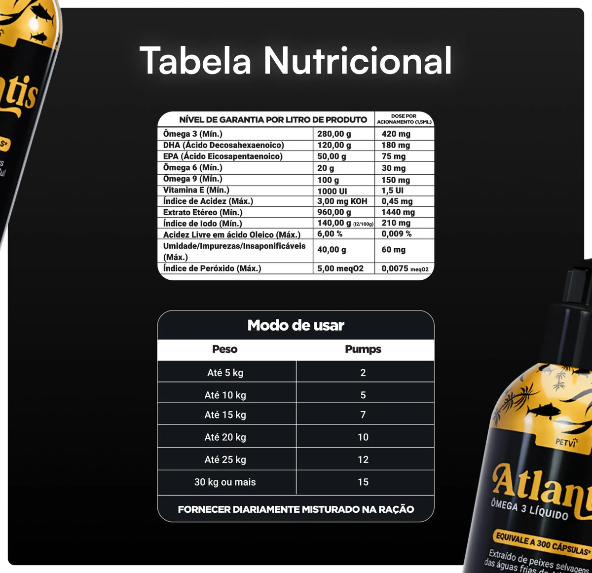 Confira a dosagem indicada no rótulo, que varia conforme o peso do animal. Depois, é só pressionar o pump da embalagem do Atlantis na ração do seu pet e misturar. Ele vai adorar o sabor!